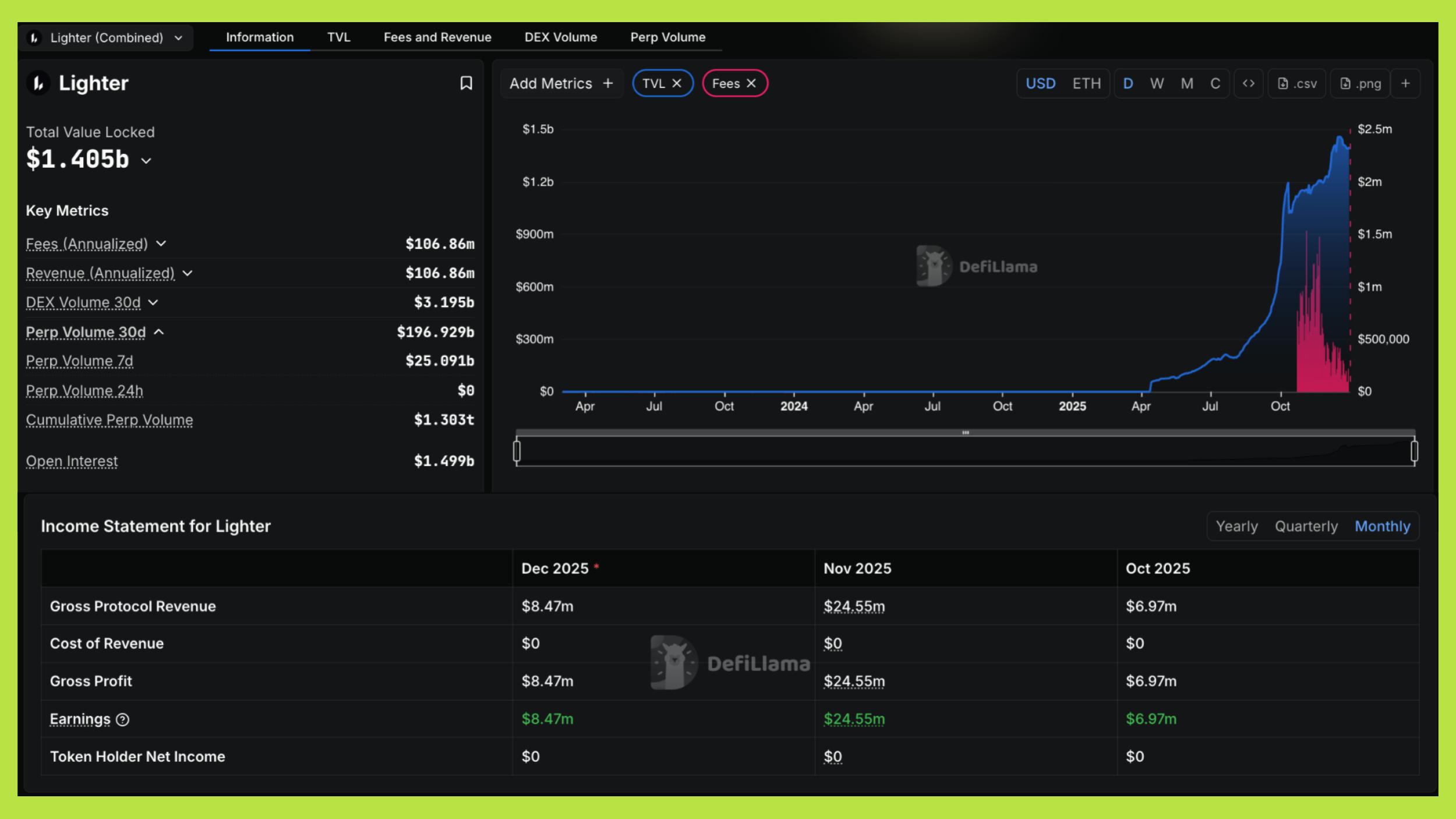 Về hiệu quả vận hành, Lighter đang ghi nhận phí giao dịch và doanh thu annualized đều ở mức khoảng 106.86 triệu USD. Doanh thu theo tháng có sự biến động theo điều kiện thị trường, với 24.55 triệu USD trong tháng 11/2025, 6.97 triệu USD trong tháng 10/2025 và 8.47 triệu USD trong tháng 12/2025 (tạm tính). Chi phí vận hành gần như bằng 0 cho thấy mô hình perp DEX của Lighter có biên lợi nhuận cao và khả năng mở rộng tốt khi khối lượng giao dịch tăng.