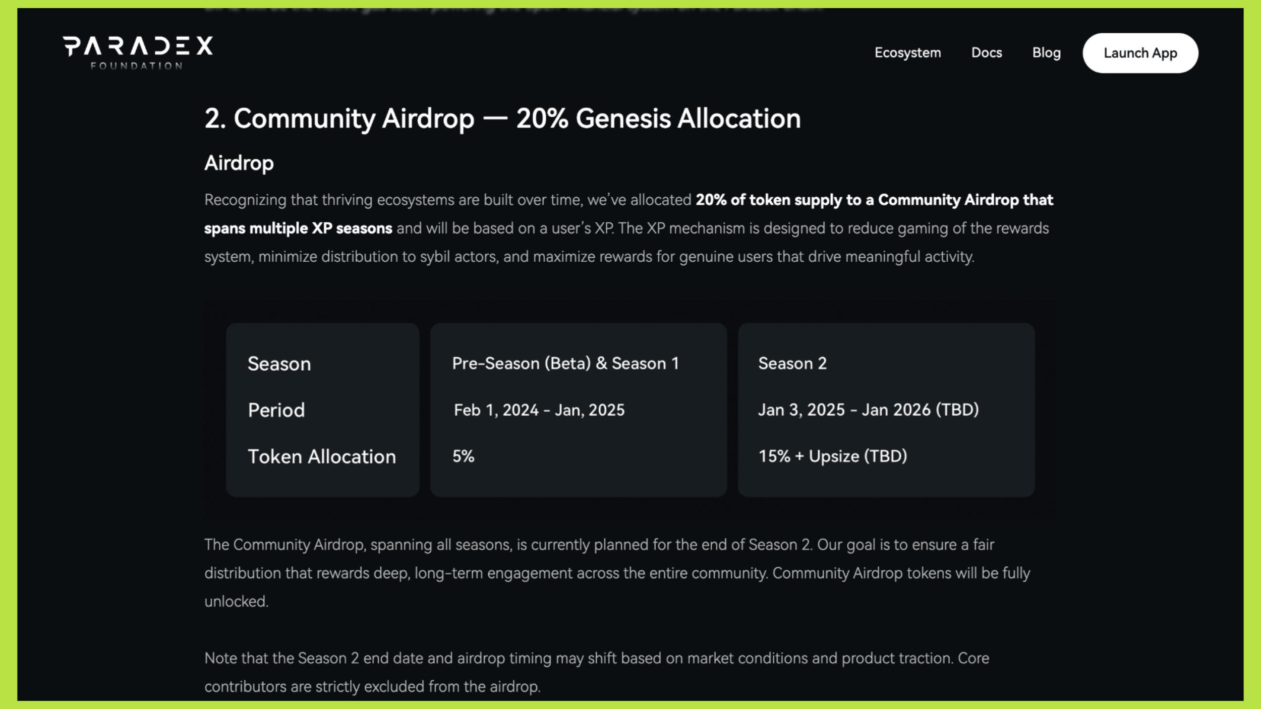 Ngoài ra, Paradex triển khai cơ hội airdrop và reward thông qua hệ thống XP, với 20% tổng cung token DIME dành cho Community Airdrop, ưu tiên người dùng tích cực giao dịch, staking, cung cấp thanh khoản và tham gia các hoạt động cộng đồng. Token airdrop được unlock hoàn toàn, kết hợp với listing trên Paradex, giúp người dùng tham gia sớm có cơ hội nhận thưởng. Tuy nhiên, giá trị token và reward phụ thuộc vào nhiều yếu tố như volume giao dịch, tính ổn định và sự phát triển của hệ sinh thái, nên không được đảm bảo lợi nhuận.
