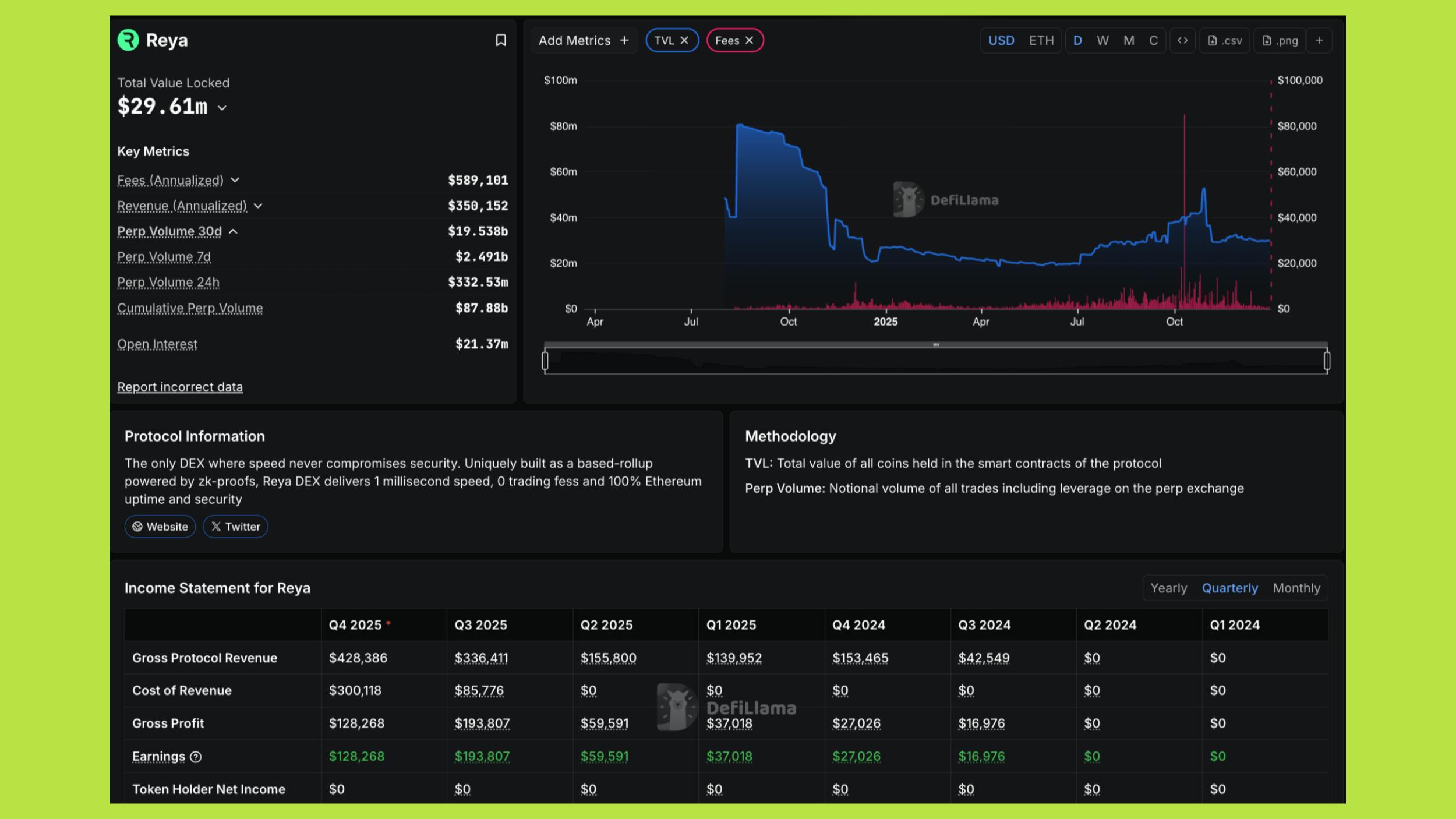 Về hiệu quả vận hành, Reya ghi nhận phí giao dịch annualized khoảng 589 nghìn USD và doanh thu annualized khoảng 350 nghìn USD. Xét theo từng quý, doanh thu có xu hướng tăng dần: Q4/2025 đạt khoảng 428 nghìn USD, Q3/2025 khoảng 336 nghìn USD, trong khi các quý trước đó ghi nhận mức doanh thu thấp hơn. Điều này cho thấy hoạt động kinh doanh của Reya đang dần cải thiện song song với sự tăng trưởng về khối lượng giao dịch.