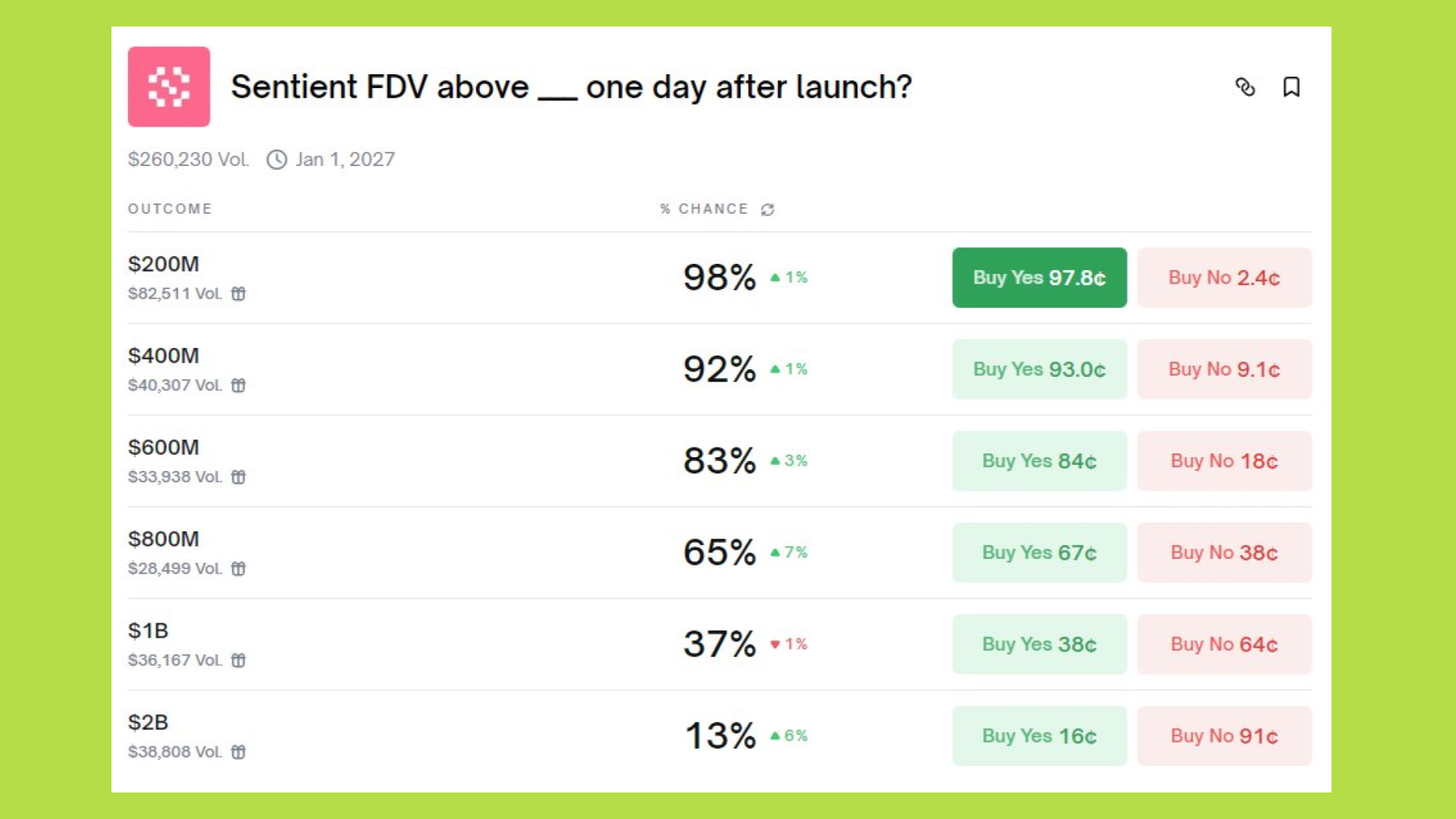 Tâm lý cộng đồng đối với Sentient đang ở mức rất tích cực. Dữ liệu từ Polymarket cho thấy 65% nhà đầu tư tin tưởng rằng FDV của dự án sẽ duy trì trên mức 800 triệu USD ngay trong ngày đầu tiên niêm yết.