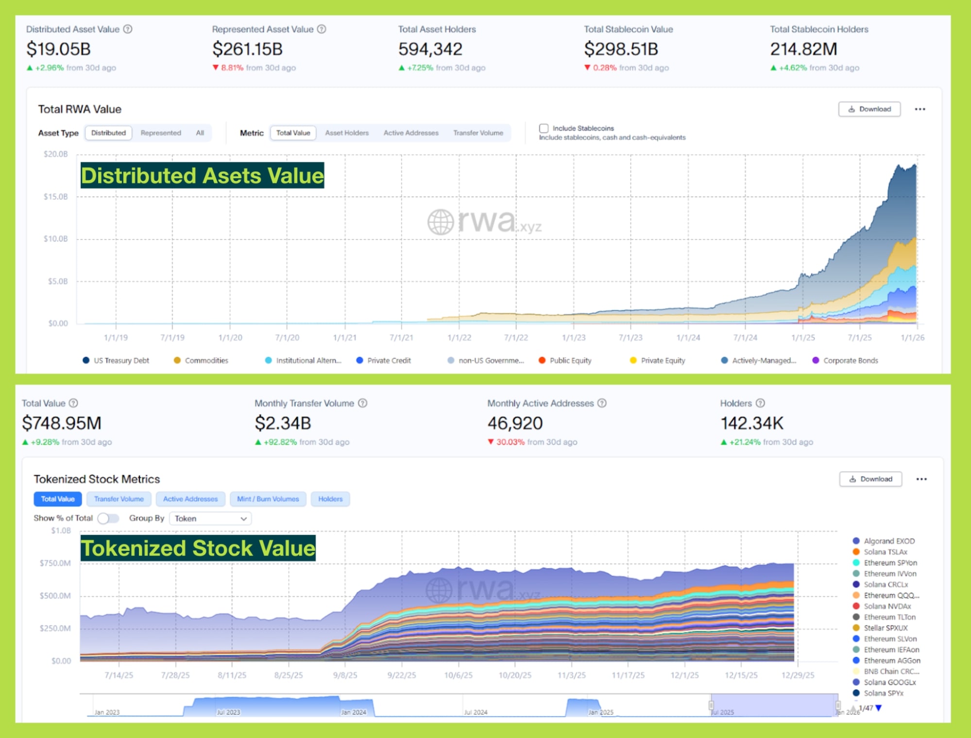 Một nhánh RWAs khác là cổ phiếu token hóa, hiện còn nhỏ (~750 triệu USD giá trị, ~2 tỷ USD volume/tháng) nhưng được dự báo vượt 10 tỷ USD vào cuối 2026, với Robinhood là bên dẫn dắt. Cột mốc quyết định sẽ là khi ngân hàng và định chế lớn chấp nhận cổ phiếu token hóa làm tài sản thế chấp hợp lệ.