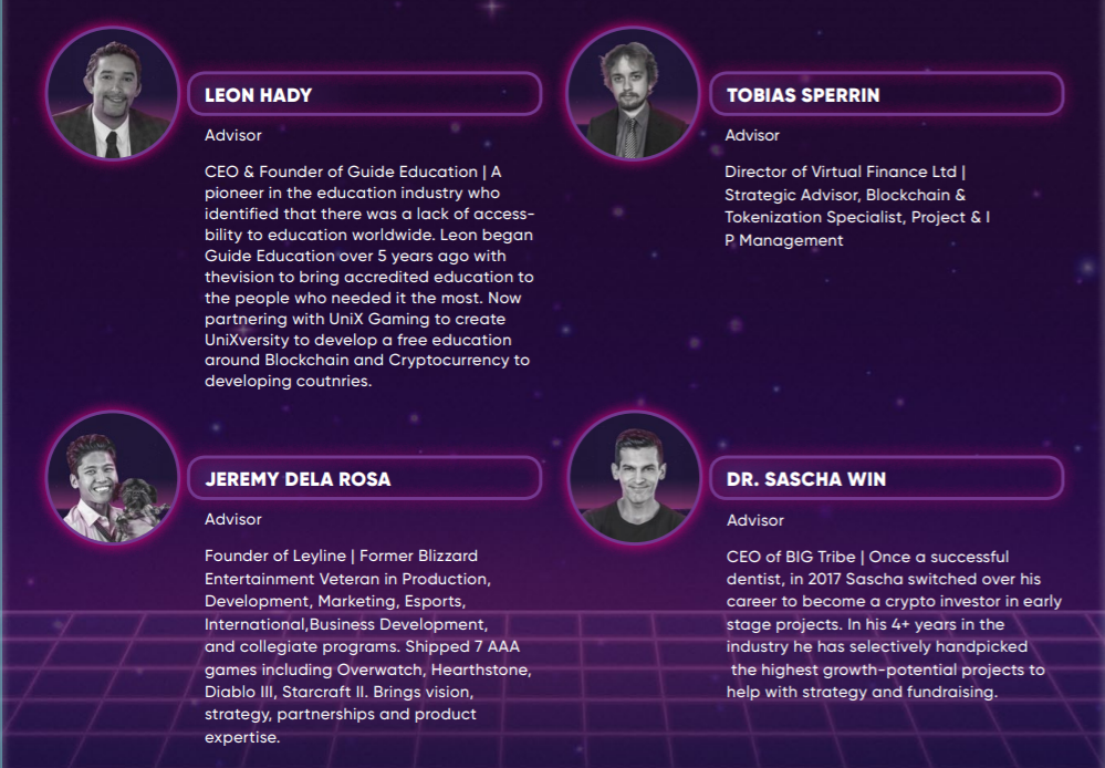 Unix Gaming sở hữu một dàn cố vấn khá hùng hậu, bao gồm những cá nhân đã có nhiều kinh nghiệm và thành tựu trong lĩnh vực tài chính nói chung và trong thế giới blockchain nói riêng.
