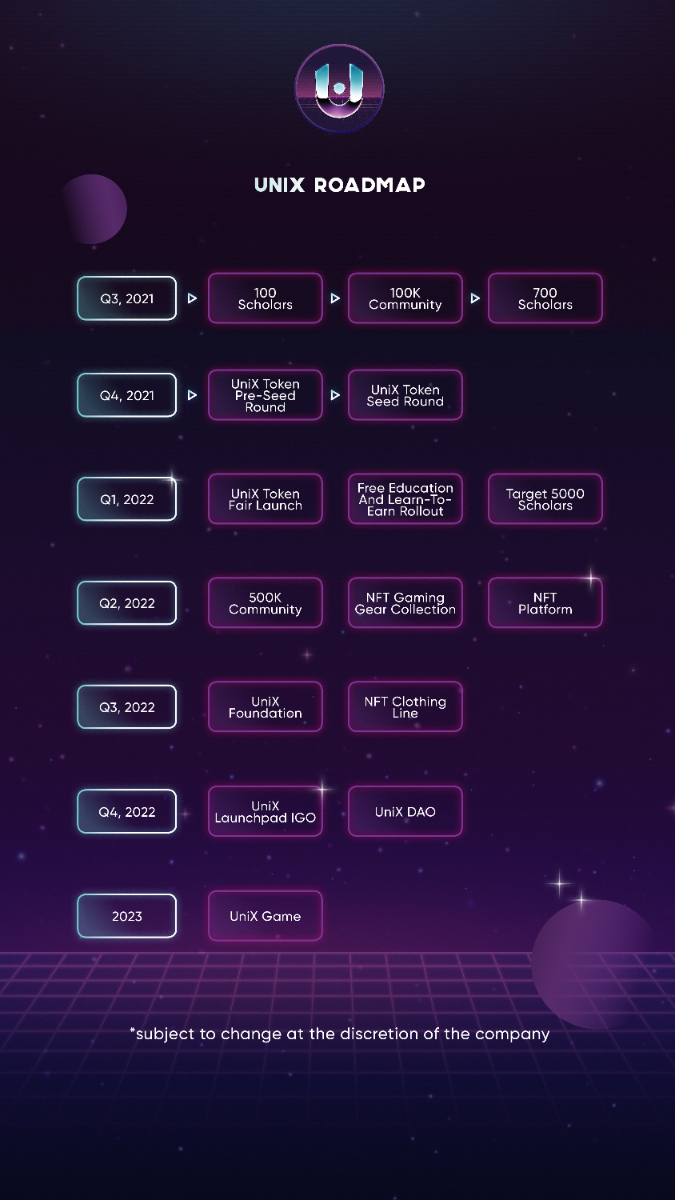 - Learn to Earn: Đây là mô hình giáo dục dự án đang triển khai; một phần lợi nhuận thu về sẽ được sử dụng để cung cấp giáo dục miễn phí cho cộng đồng. Dự án đã lập ra Unix Foundation để phụ trách lĩnh vực này, tạo ra các khóa học xoay quanh nhiều chủ đề như ngôn ngữ, cryptocurrency, kiến thức về tài chính..