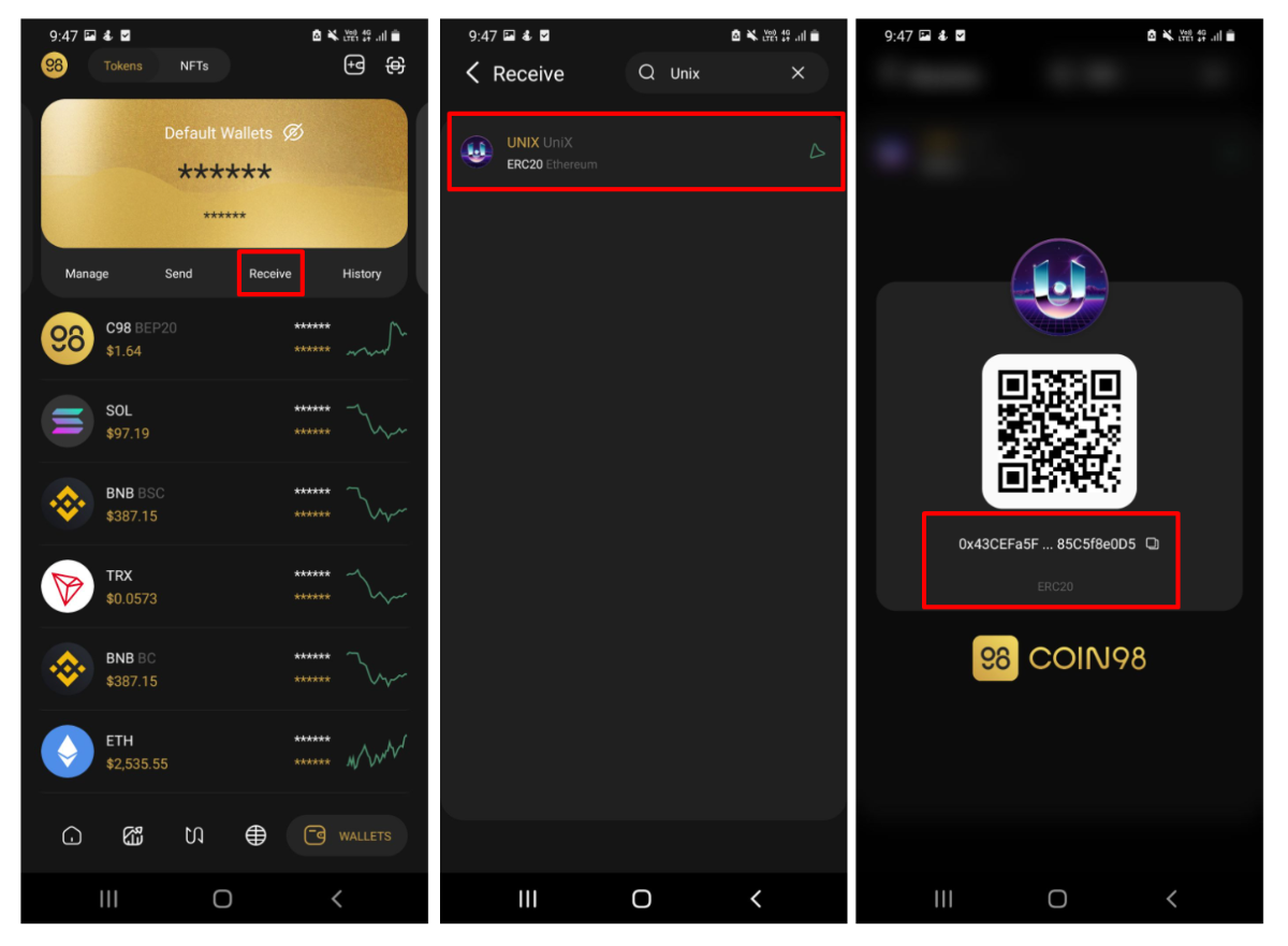 Vì UNIX là token có chuẩn ERC-20 nên có thể lưu trữ trực tiếp trên ví Coin98 theo các bước sau đây: