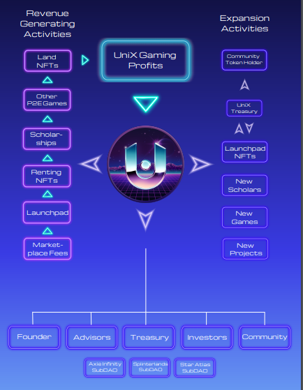 Cuối cùng, Unix Gaming hướng tới việc phát triển thành một DAO, mỗi tựa game với các tài sản NFT và hoạt động liên quan sẽ được quản lý và chia thành từng subDAO. Các subDAO này sẽ được biến thành các token và một phần của lượng token này sẽ được chuyển tới cộng đồng. Các holder của subDAO token từ đó có thể biểu quyết hoặc đề xuất thay đổi liên quan tới hoạt động và cách vận hành.