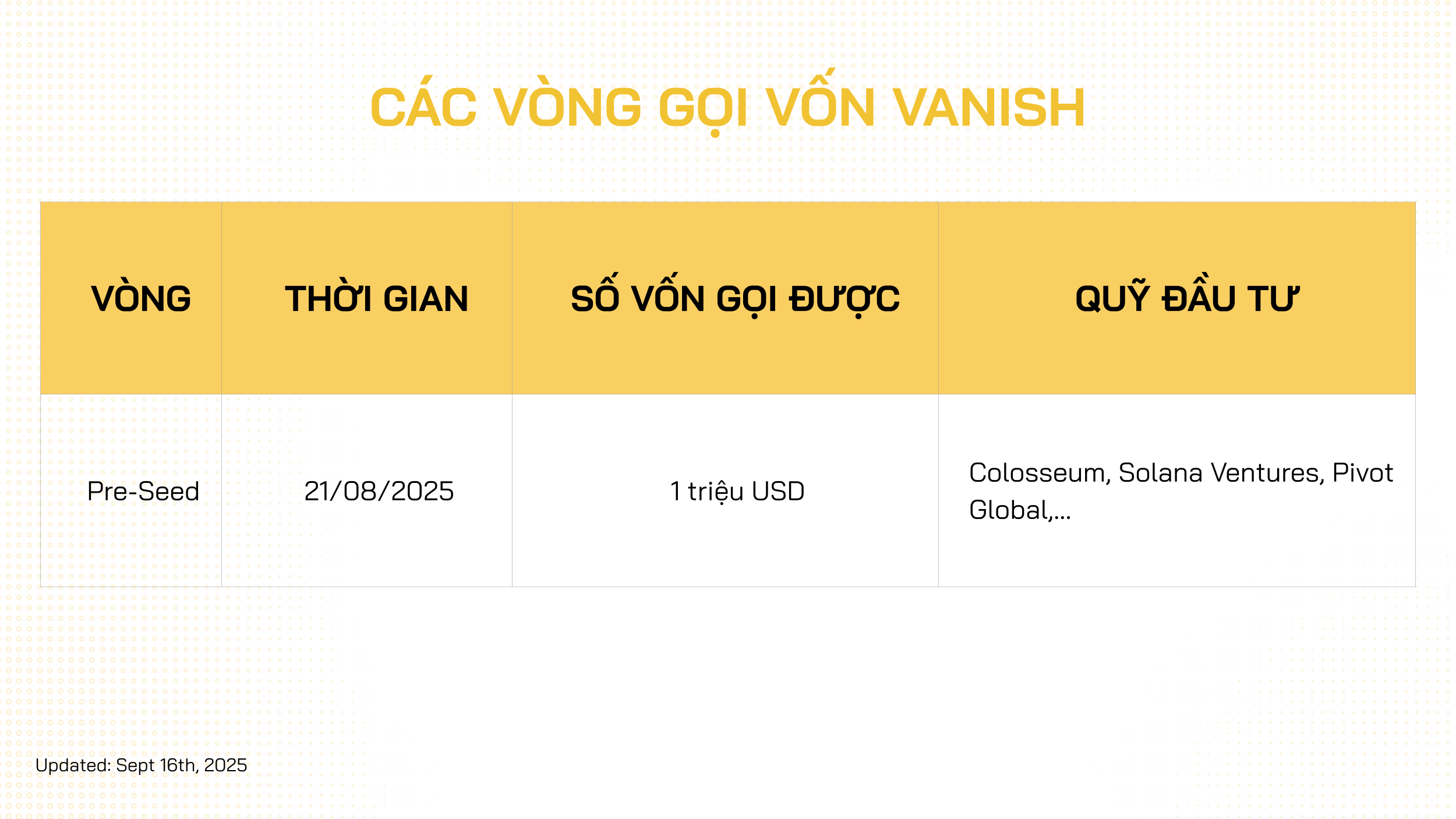 Vanish Trade đã hoàn thành vòng gọi vốn Pre-Seed vào ngày 21/08/2025, huy động được 1 triệu USD để phát triển nền tảng. Vòng gọi vốn này nhận được sự tham gia của nhiều nhà đầu tư nổi bật trong hệ sinh thái Solana và lĩnh vực blockchain.