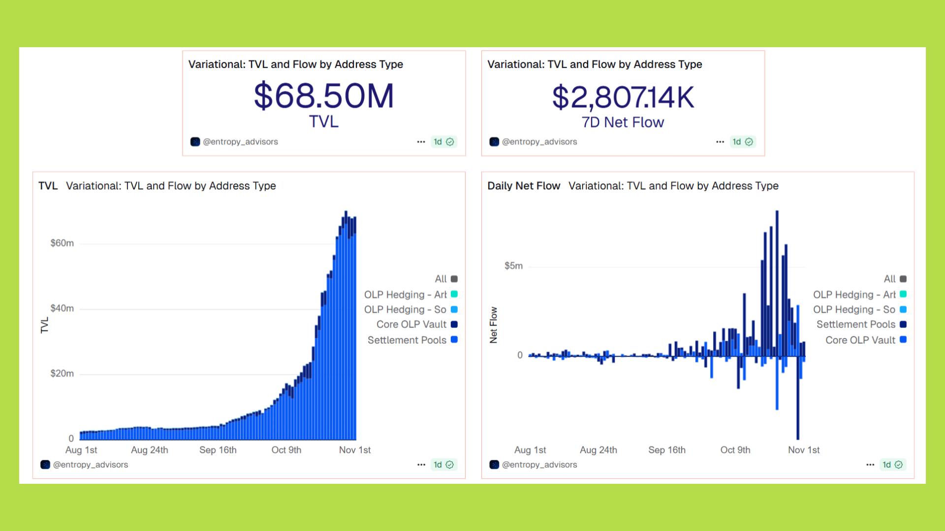 Mô hình này giúp Variational duy trì mức spread thấp, hạn chế trượt giá ngay cả khi giao dịch khối lượng lớn, và đảm bảo tính thống nhất của thanh khoản trên hàng trăm cặp tài sản khác nhau. Quan trọng hơn, OLP hoạt động theo chiến lược delta-neutral, giúp hệ thống không bị ảnh hưởng bởi biến động giá tài sản, đồng thời tạo ra lợi nhuận ổn định từ chênh lệch giá mua bán.