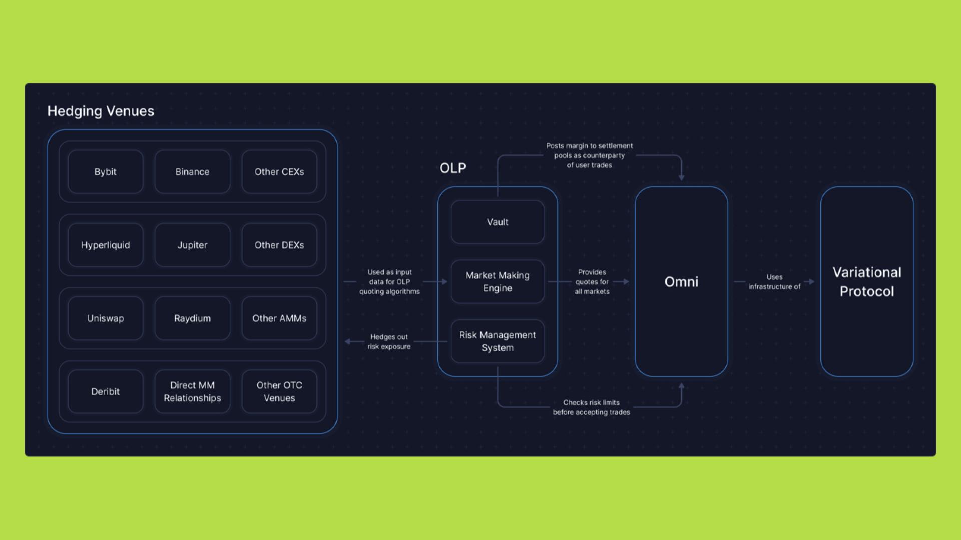 Cốt lõi của giải pháp Variational nằm ở hai yếu tố chính. Thứ nhất, Variational hợp nhất thanh khoản từ nhiều nguồn khác nhau, bao gồm cả CEX, DEX và thị trường OTC, thông qua Omni Liquidity Provider (OLP) và tự động hóa toàn bộ quy trình ký quỹ, bù trừ và thanh toán thông qua smart contract. Nhờ vậy, mỗi giao dịch được xử lý tức thì, mọi dòng tiền đều minh bạch trên chuỗi, và rủi ro đối tác gần như bị loại bỏ hoàn toàn.