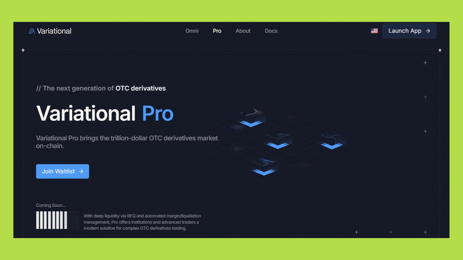 Bên cạnh Omni, Variational phát triển Pro, nền tảng dành riêng cho tổ chức tài chính, quỹ đầu tư và các nhà giao dịch chuyên nghiệp có nhu cầu thực hiện giao dịch phái sinh tùy chỉnh hoặc các hợp đồng OTC on-chain.