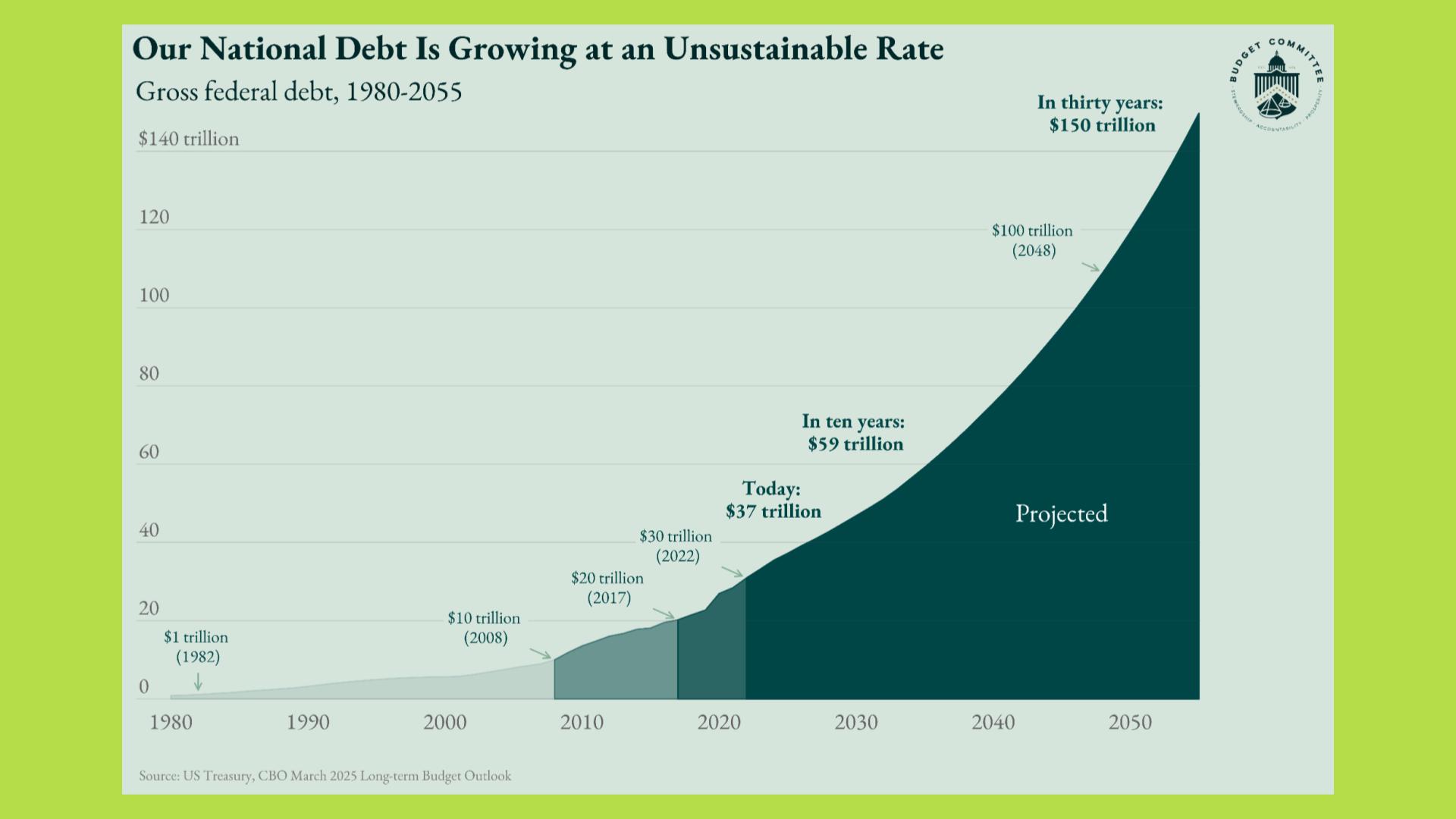 Nhìn về dài hạn, bức tranh vĩ mô tương đối rõ ràng. Các chính phủ, đặc biệt là Mỹ, đang phải đối mặt với thâm hụt ngân sách kéo dài, nợ công gia tăng nhanh và áp lực đáo hạn trái phiếu ngày càng lớn. Tính đến năm 2025, chi phí trả lãi hàng năm đã tiệm cận 1 nghìn tỷ USD, và trong các kịch bản không có điều chỉnh mang tính cấu trúc, tổng nợ có thể tăng lên tới 150 nghìn tỷ USD vào năm 2055.