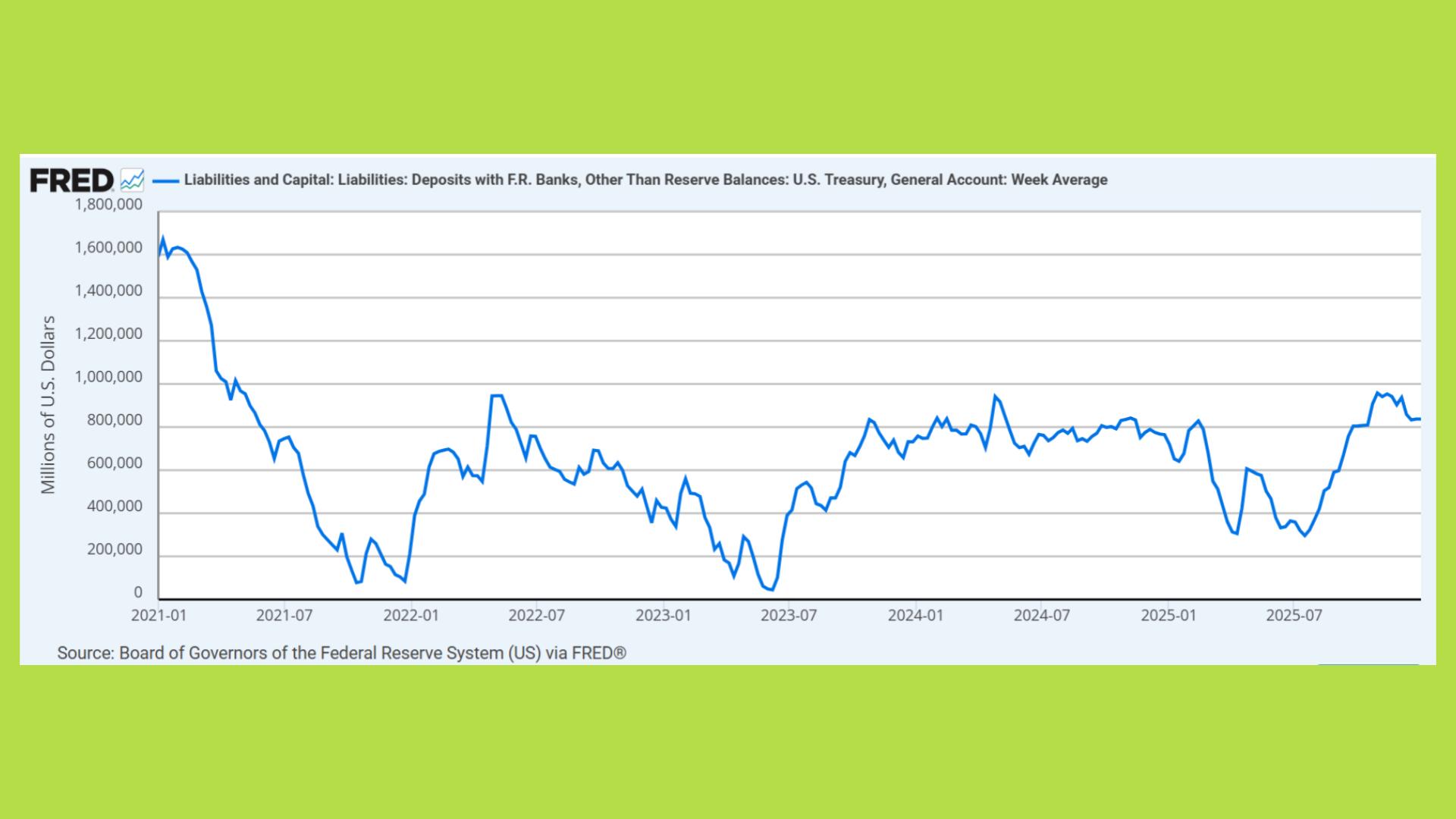 Bên cạnh đó, yếu tố tài khóa cũng tạo áp lực không nhỏ. Dữ liệu từ FRED cho thấy tài khoản của Bộ Tài chính Mỹ tại Fed (TGA) đã được tăng mạnh trong nửa cuối năm 2025. Đến cuối năm, số dư TGA đạt khoảng 837 tỷ USD, tăng hơn 500 tỷ USD so với giữa năm.