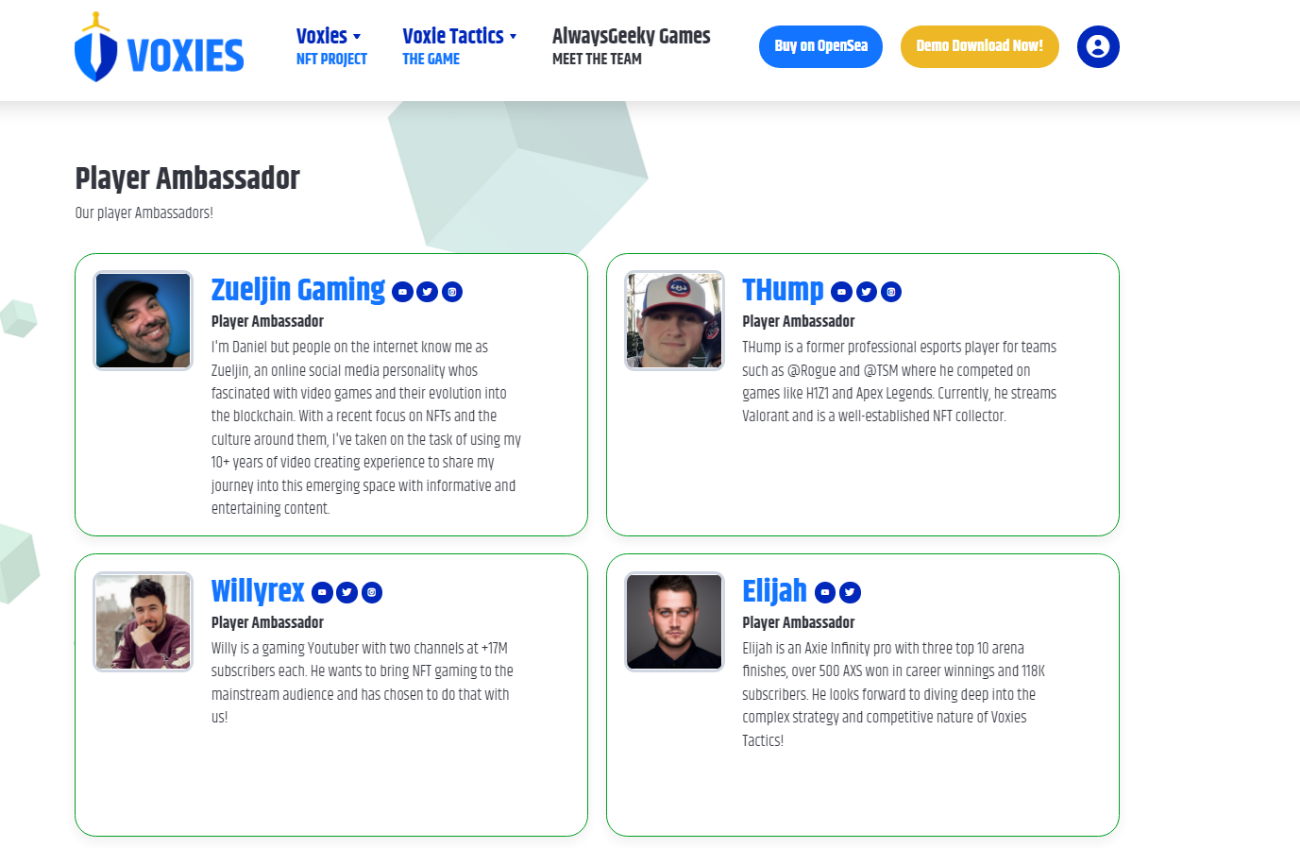 Thêm nữa, Voxies cũng sẽ có những đại sứ để quảng bá cho hình game của games cho từng phân khúc thị trường mà dự án hướng đến. Hầu hết các đại sứ (Ambassadors) đều là những streamer hay pro players với sự nổi tiếng và gây dựng được hình ảnh và sở hữu một lượng fan hâm mộ lớn.