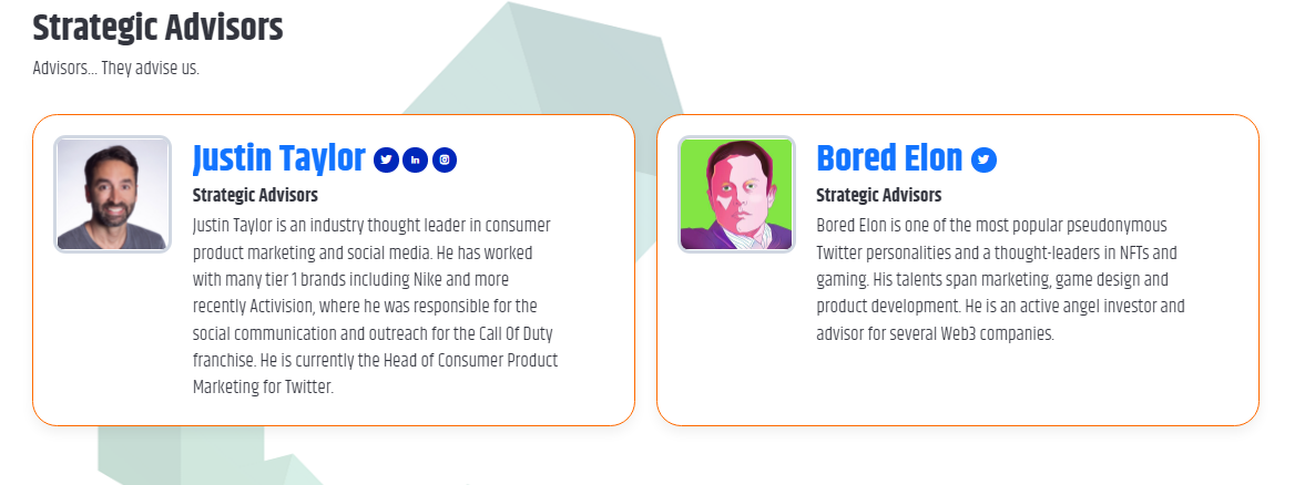 - Bored Elon: Là người sở hữu tài khoản twitter cá nhân lên đến 1.5 triệu lượt follow. Anh thường xuyên chia sẻ những suy nghĩ về mảng NFT và Gaming được xếp vào hàng tầm cỡ của ngành. Ngoài ra, anh còn là nhà đầu tư thiên thần cũng như tham gia cố vấn cho một số dự án về Web3.