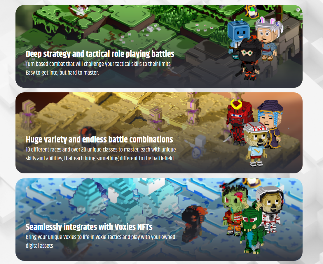 Voxies là một NFT game 3D nhập vai chiến thuật miễn phí mang hơi hướng cổ điển được xây dựng trên Ethereum. Cách chơi của game cũng sẽ tương tự như các games nhập vai và chiến thuật truyền thống nhưng được xây dựng dựa trên công nghệ blockchain.
