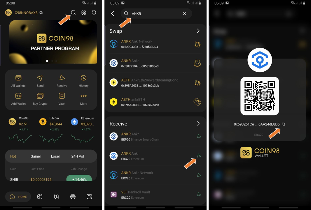 Step 3: Click on the correct result at Receive Tab, copy the wallet address and send ANKR to this address.