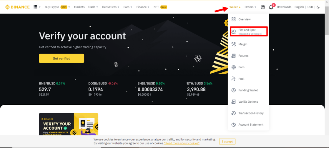 Click Wallet, then choose Fiat and Spot.