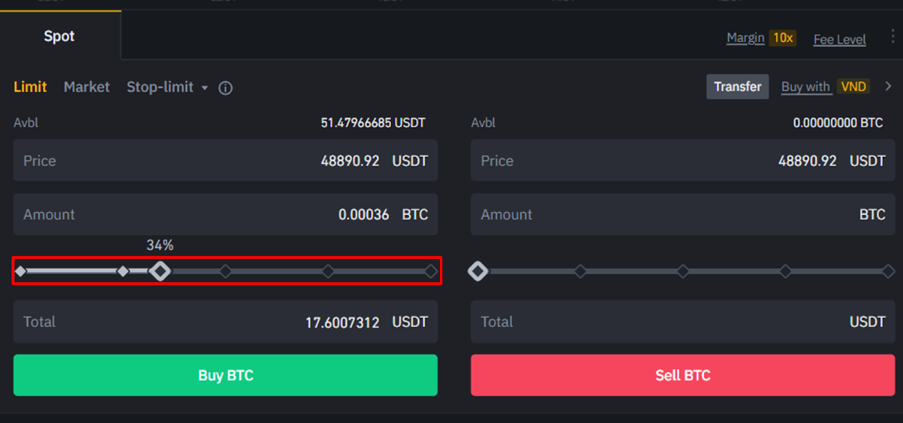 You can also easily adjust the percentage of funds you want to use that coin/ token by using the slider below.