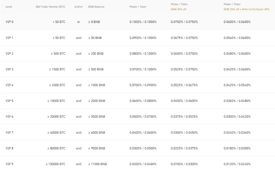 - Exchange Fees: Binance tokens are used to reduce the cost of trading, margin, and other activities. The platform currently offers 10 Tiers for users based on the amount of their BNBs holding.