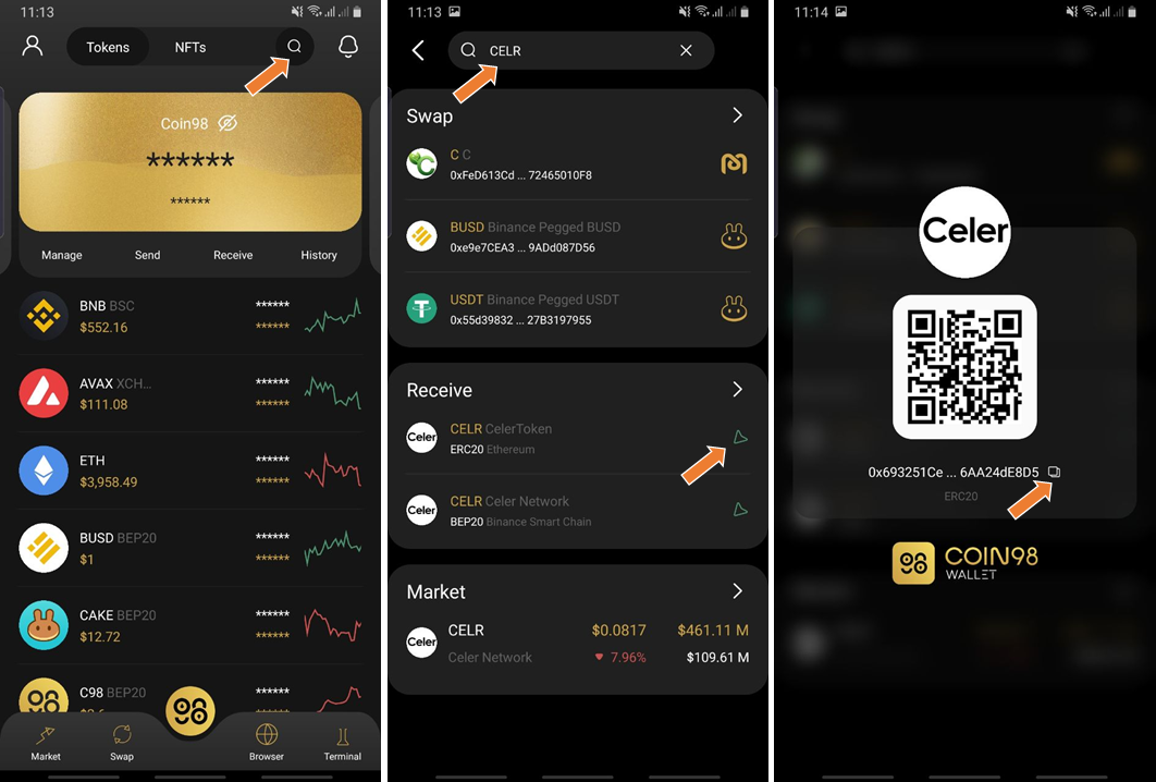 You can store CELR on Coin98 Wallet with these steps: