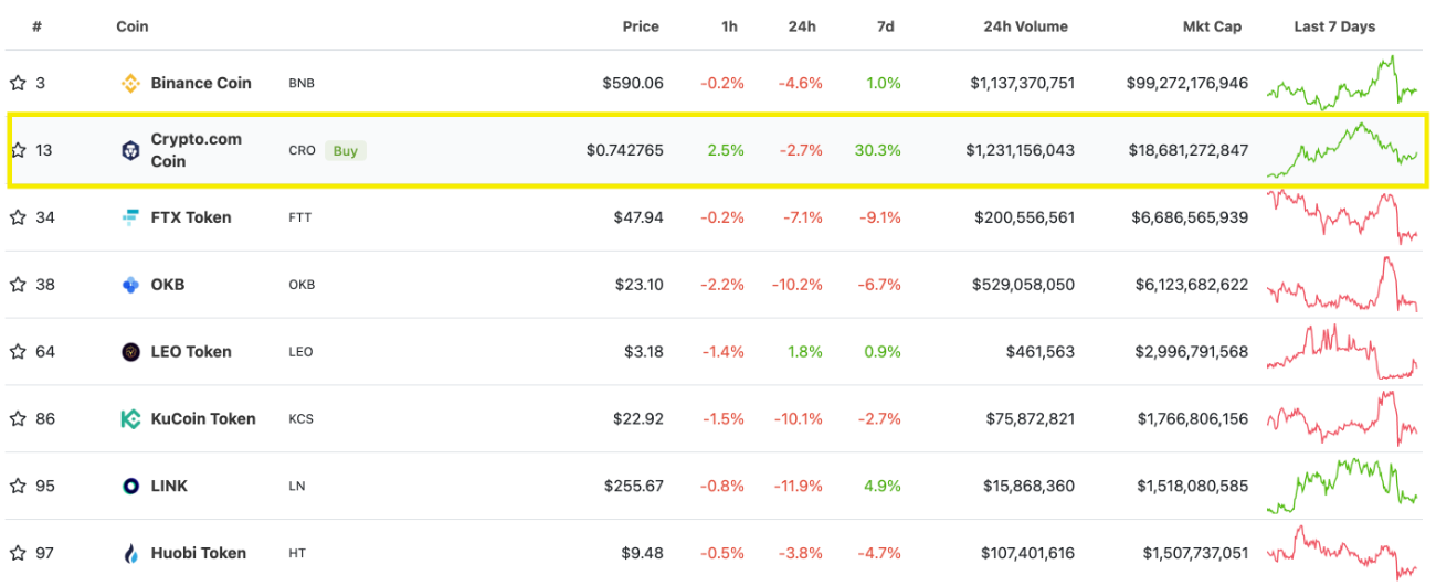 Binance Smart Chain: A notable exemplar for Cronos. The BNB token is used for both the network and the Binance Centralized Exchange. Its market capitalization is only behind BTC & ETH and it is also the third largest coin in the market.