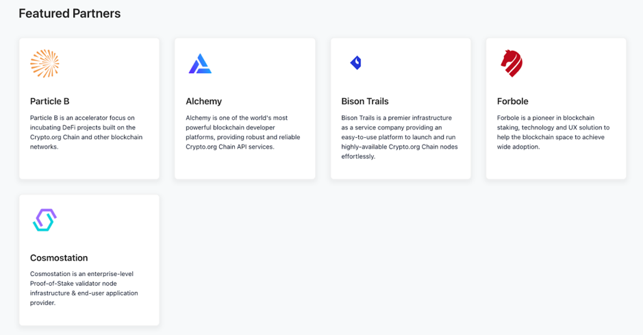 Cronos has a large number of partners. Some of their crucial partners are in Infrastructure, Validators, blockchain analytics and Risk Management fields.