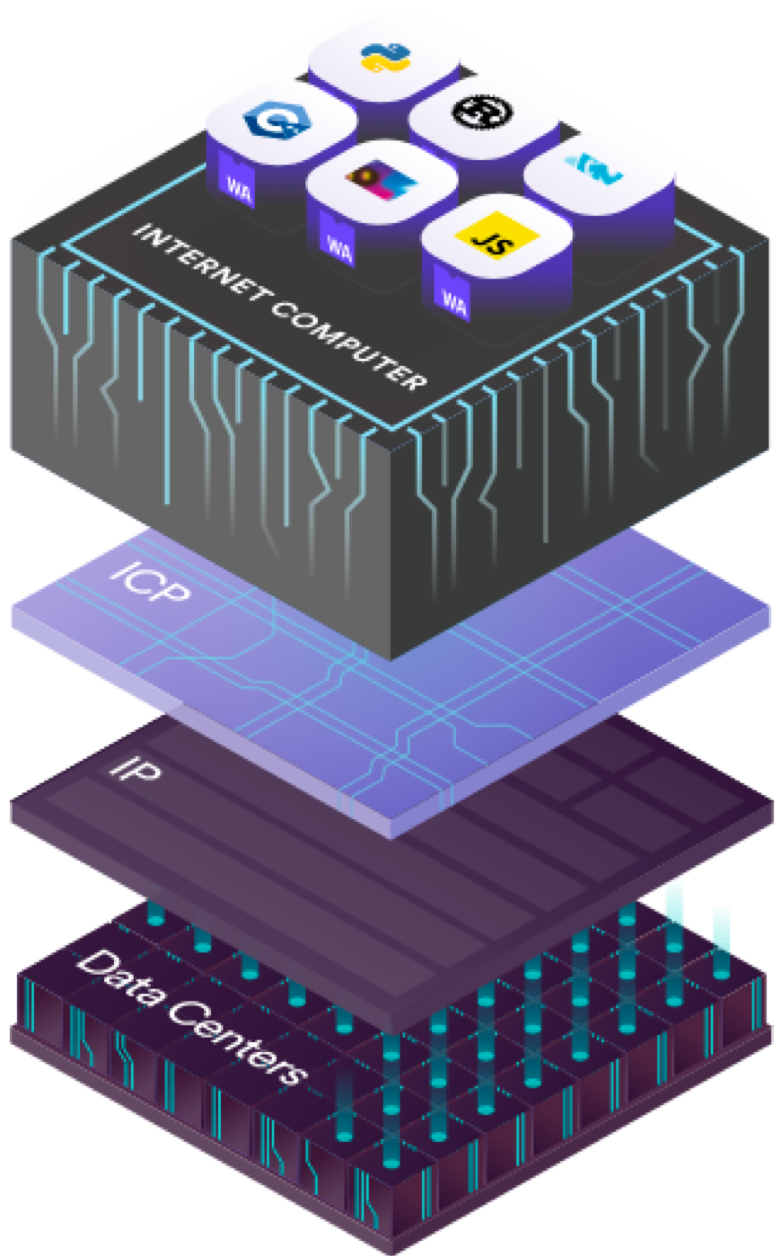 ICP's structure consists of four layers, as shown below. Users and developers can use smart contracts known as canisters to deploy code and store data on the top layer—the Internet Computer Protocol.