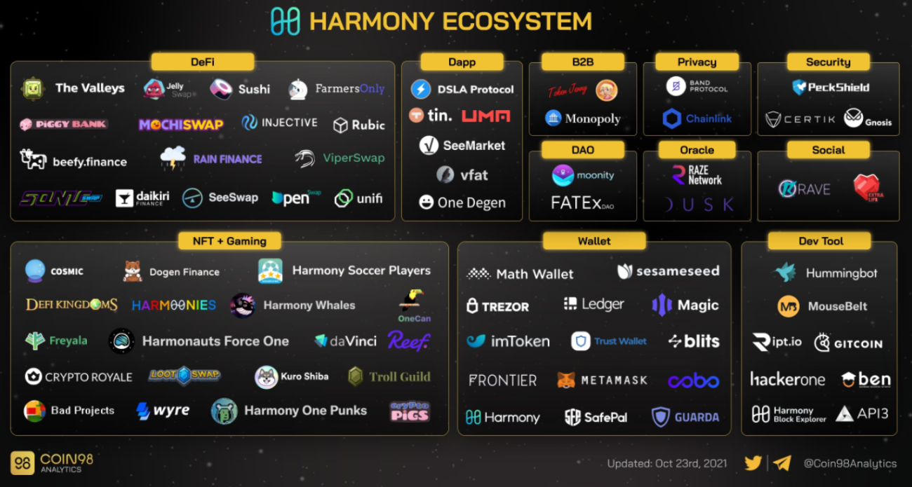 The Harmony ecosystem has grown tremendously over the past 2 years. The current ecosystem maps of the project are fulfilled with important projects and dApps. Compared to other blockchains such as Ethereum or Solana, the ecosystem of Harmony might not be completed yet as it is still in its early stages. However, this will leave room for other projects to deploy on Harmony and investment opportunities for early investors.
