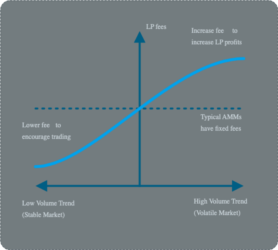 - Dynamic Fees: Trading fees are adjusted dynamically according to on-chain market conditions. In a volatile market (higher than usual volume), fees automatically increase to an optimal level for higher fees, which will go to liquidity providers. In periods of low volatility, fees decrease to encourage more trading and total fees collected.