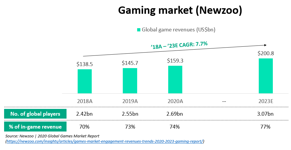 According to Newzoo, one of the top data collectors on the gaming market, the gaming market has witnessed a gradual growth annually. At this rate, this market can totally reach $200B revenue and 3 billion global players in 2023.