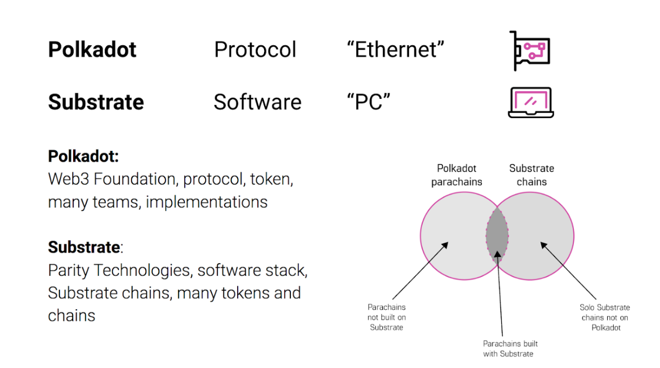 Substrate: Substrate can simply be understood as a framework that makes it easier to build Blockchain. Projects built with Substrate can run on Polkadot, but projects built on Substrate can exist as a standalone platform.