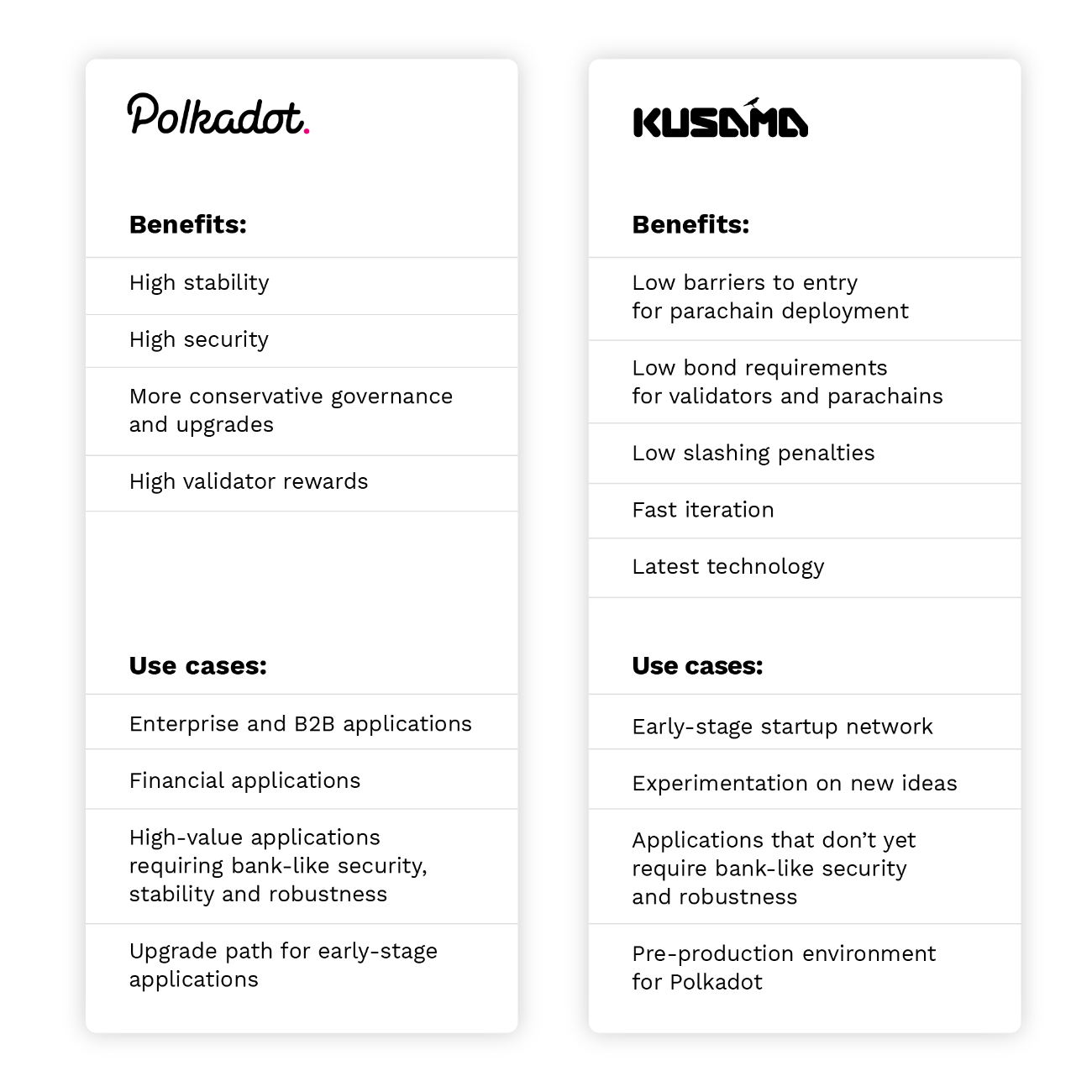 Web3 Foundation has created another Replay Chain named Kusama, which runs in parallel with Polkadot Relay Chain. It will be an early, highly experimental version of Polkadot presenting real economic conditions. Therefore, Kusama is riskier and wilder than those of Polkadot.