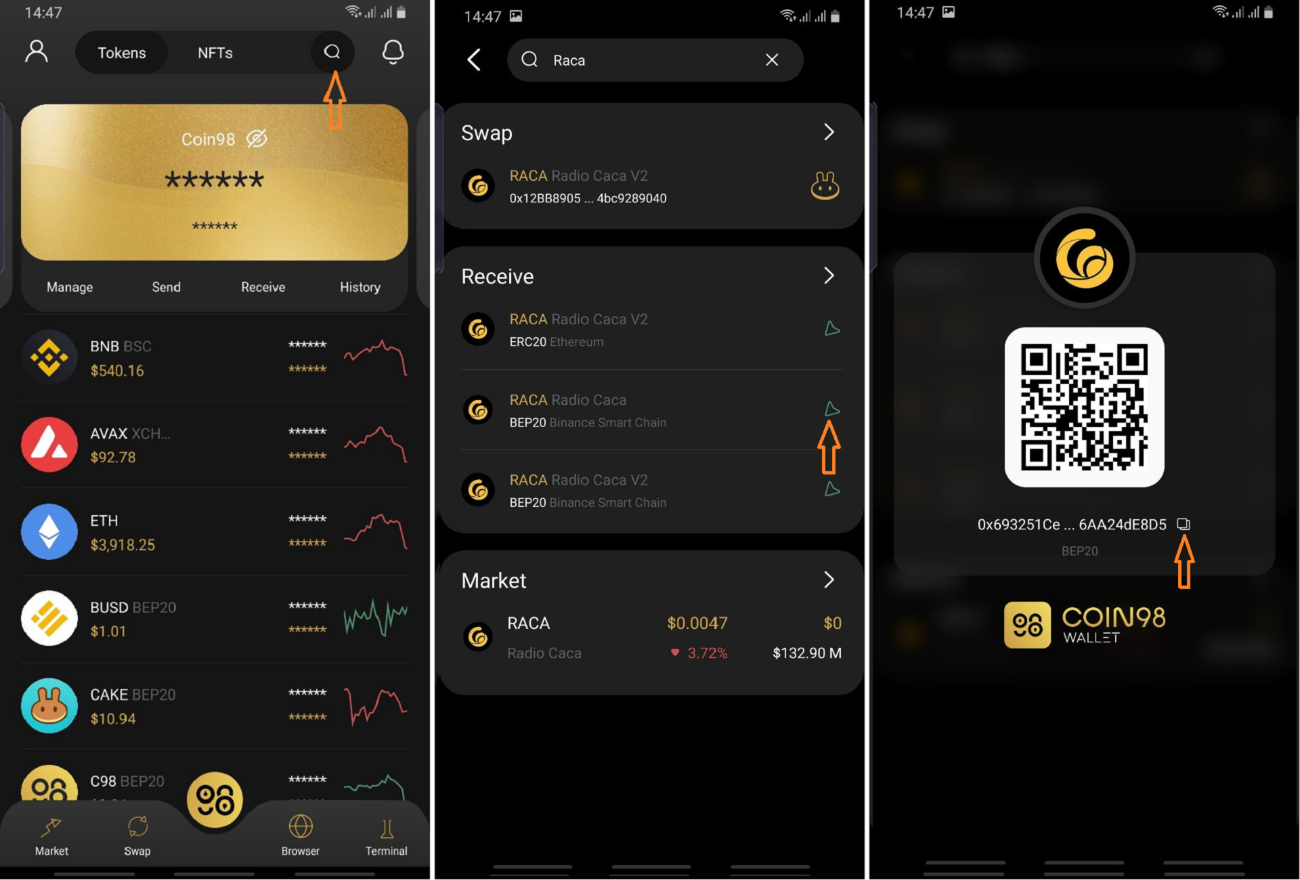 You can store RACA on Coin98 Wallet with these steps: