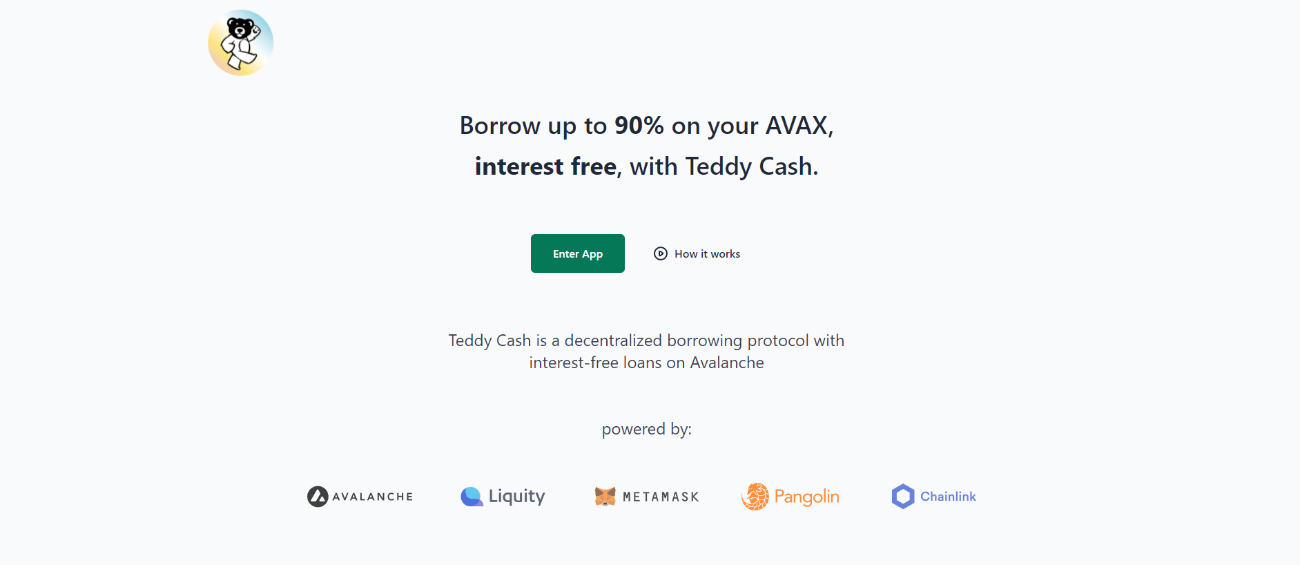 Teddy Cash is a non-custodial, unchangeable, and self-governing protocol that enables interest-free loans backed by AVAX. Loans are paid out in TSD (a stablecoin pegged to the US dollar) and need a minimum collateral ratio of 110 percent.