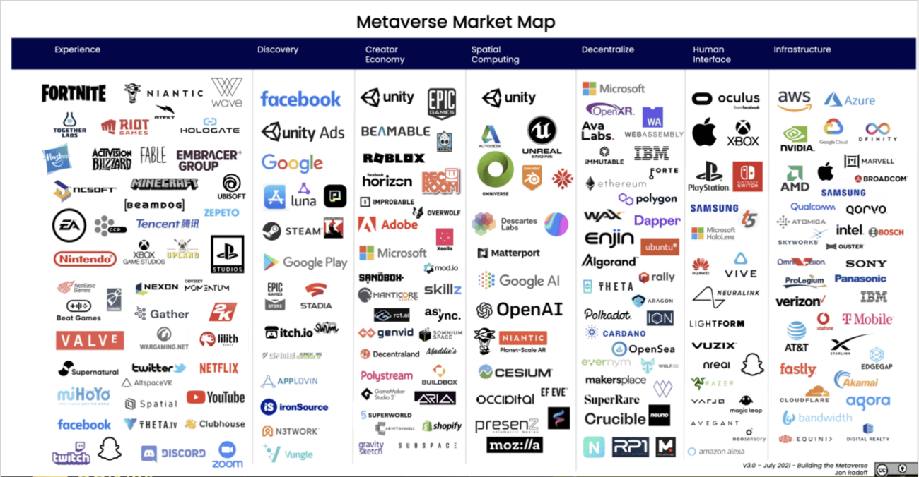 It can be clearly illustrated that the Metaverse industry involves the participation of multiple tech companies in fields ranging from hardware, software, to blockchain or gaming.