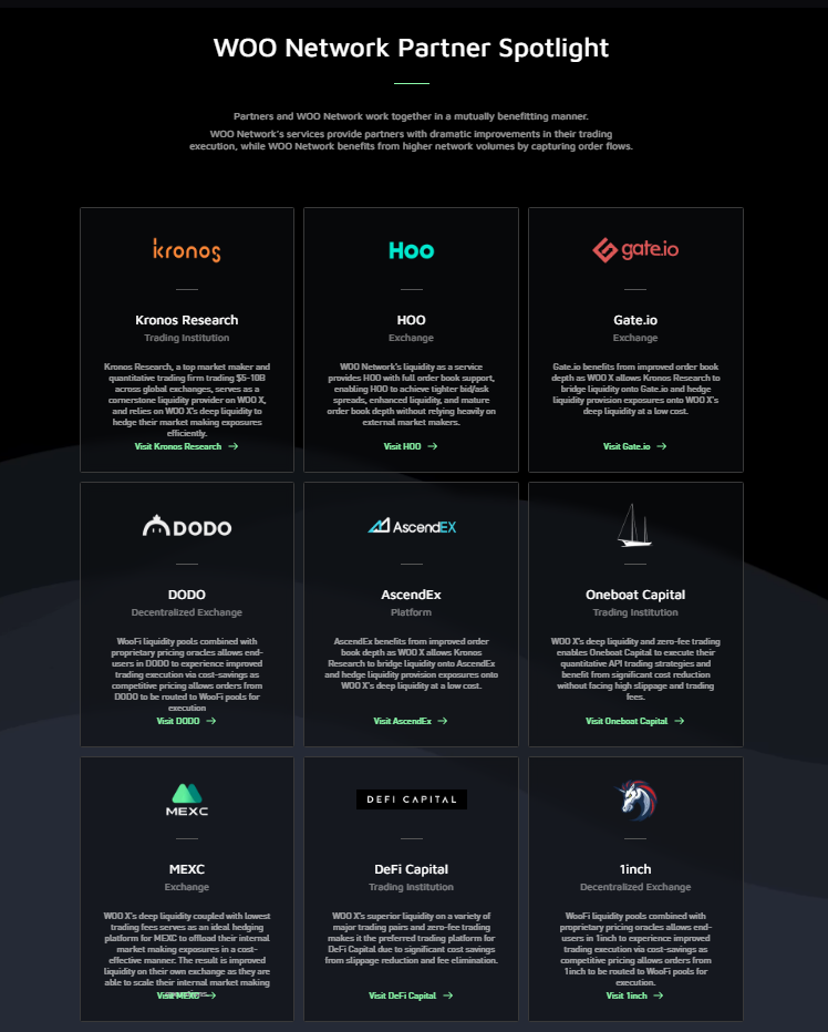 WOO Network hiện đang có nhiều đối tác ở tầm các dự án đơn lẻ bao gồm các sàn giao dịch tập trung như MEXC, Gate.io hay các sàn phi tập trung như DODO, 1inch và các nền tảng nghiên cứu hay tổ chức khác.