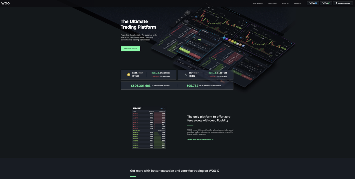WOO X: Cung cấp sàn giao dịch cho người dùng cuối và tận dụng nguồn thanh khoản từ mạng lưới của WOO Network, nhằm cung cấp cho các nhà giao dịch chuyên nghiệp dịch vụ giao dịch với thanh khoản cao và mức phí gần như bằng 0.