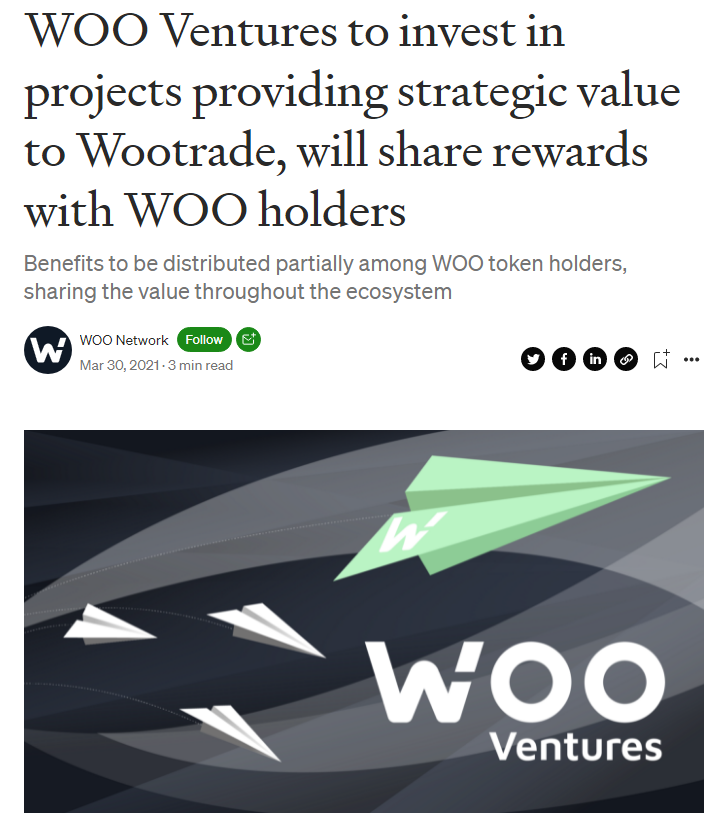 Tuy nhiên, với WOO Ventures thì khác, họ vẫn trích ra 50% lợi nhuận từ các thương vụ đầu tư (nếu có) để trả lại cho những người nắm giữ WOO token nhưng sẽ biến thiên ở nhiều hình thức. Có thể là staking để nhận thêm rewards,...