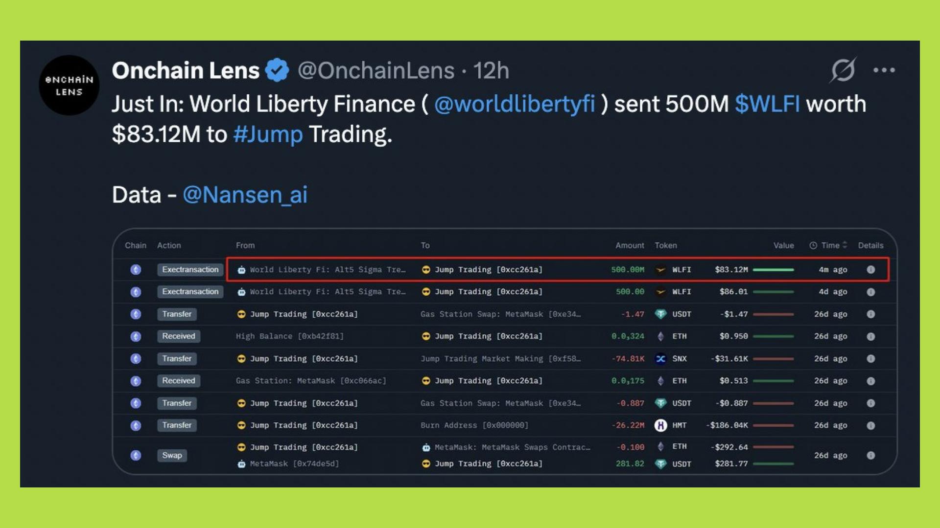 Cuối cùng, các diễn biến on-chain sau bỏ phiếu càng làm gia tăng nghi ngại. Sau khi proposal được thông qua, ghi nhận các giao dịch lớn, đáng chú ý là 500 triệu WLFI được chuyển tới Jump Trading, trong khi token của nhiều nhà đầu tư cá nhân vẫn bị khóa. Dù những giao dịch này chưa đủ cơ sở để kết luận sai phạm, thời điểm thực hiện đã làm dấy lên lo ngại về áp lực bán một chiều và mức độ bất cân xứng trong hệ sinh thái WLFI.