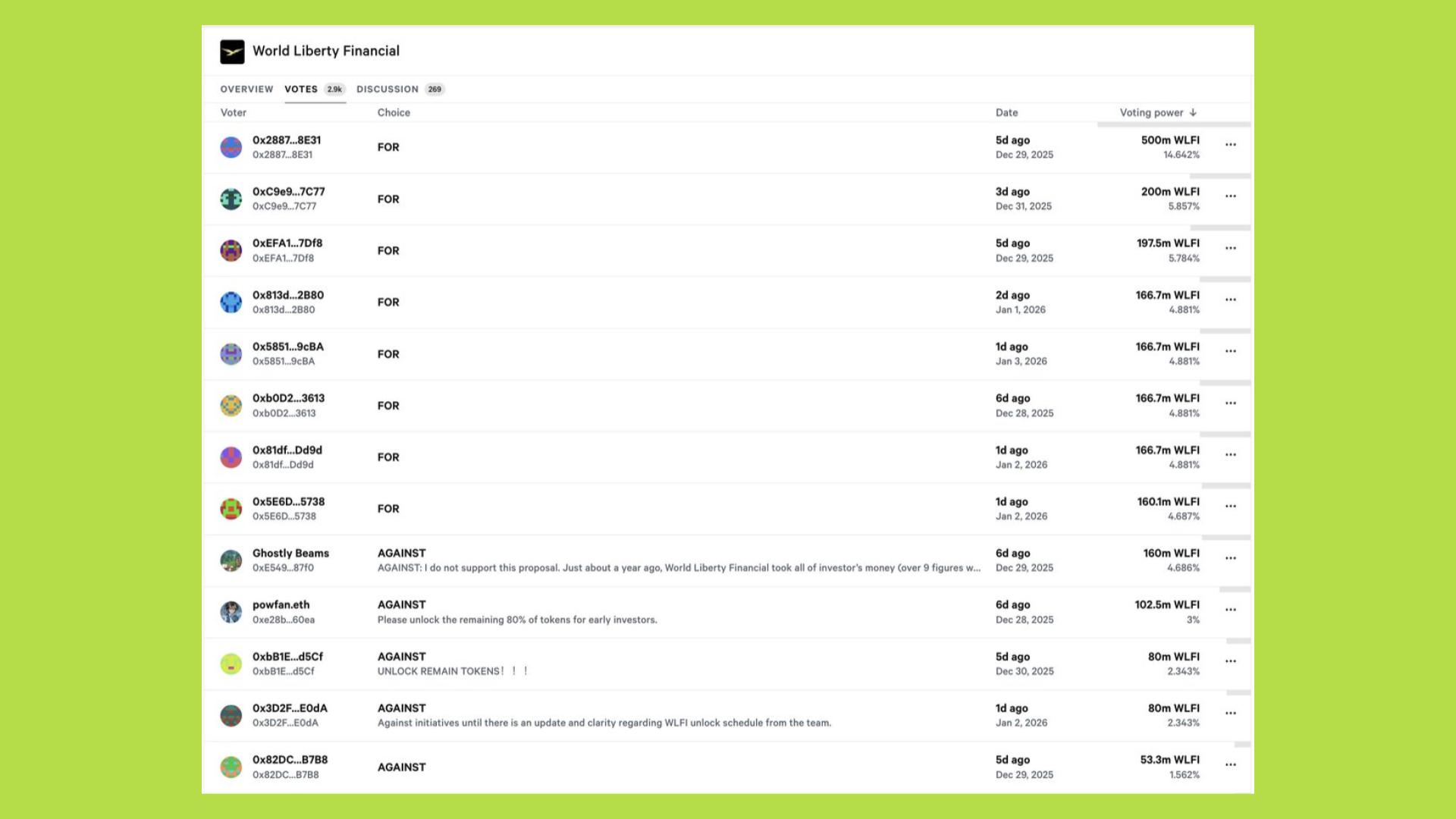 Làn sóng chỉ trích xoay quanh WLFI không bắt nguồn từ bản thân đề xuất thúc đẩy USD1, mà chủ yếu xuất phát từ cách governance được vận hành và cấu trúc lợi ích phía sau dự án. Dữ liệu trên Snapshot cho thấy các phiếu FOR có trọng số lớn nhất đều đến từ những ví nắm giữ hàng trăm triệu WLFI.