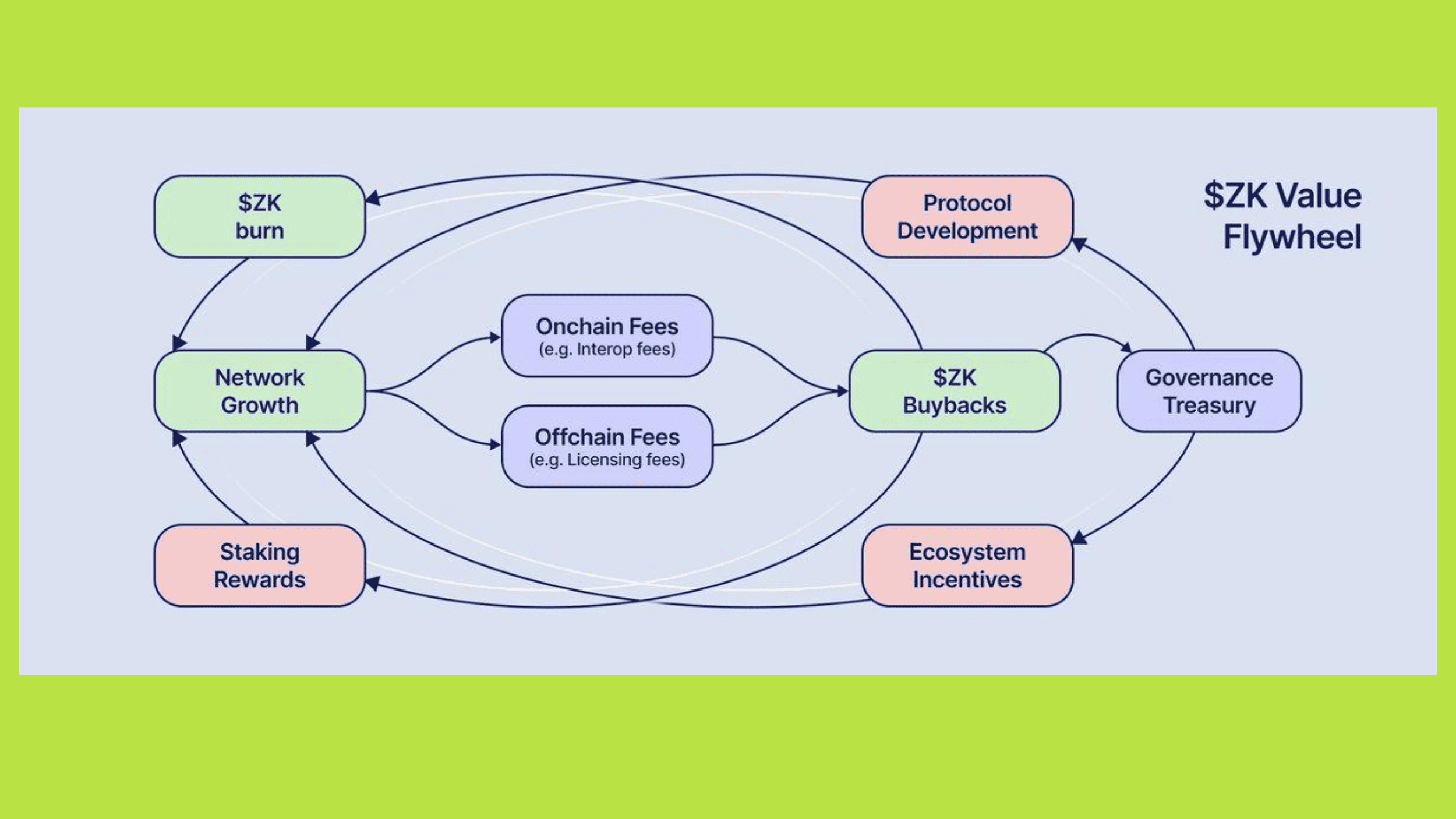 Theo mô hình mới, ZKsync áp dụng cơ chế Value Flywheel cho token ZK. Toàn bộ giá trị tạo ra từ hoạt động on-chain và off-chain bao gồm phí chuyển tài sản, các giao dịch liên chuỗi cũng như nhu cầu sử dụng công nghệ từ các tổ chức sẽ được gom lại và dùng để mua lại ZK từ thị trường. Phần token mua về này sau đó được phân bổ có chủ đích: